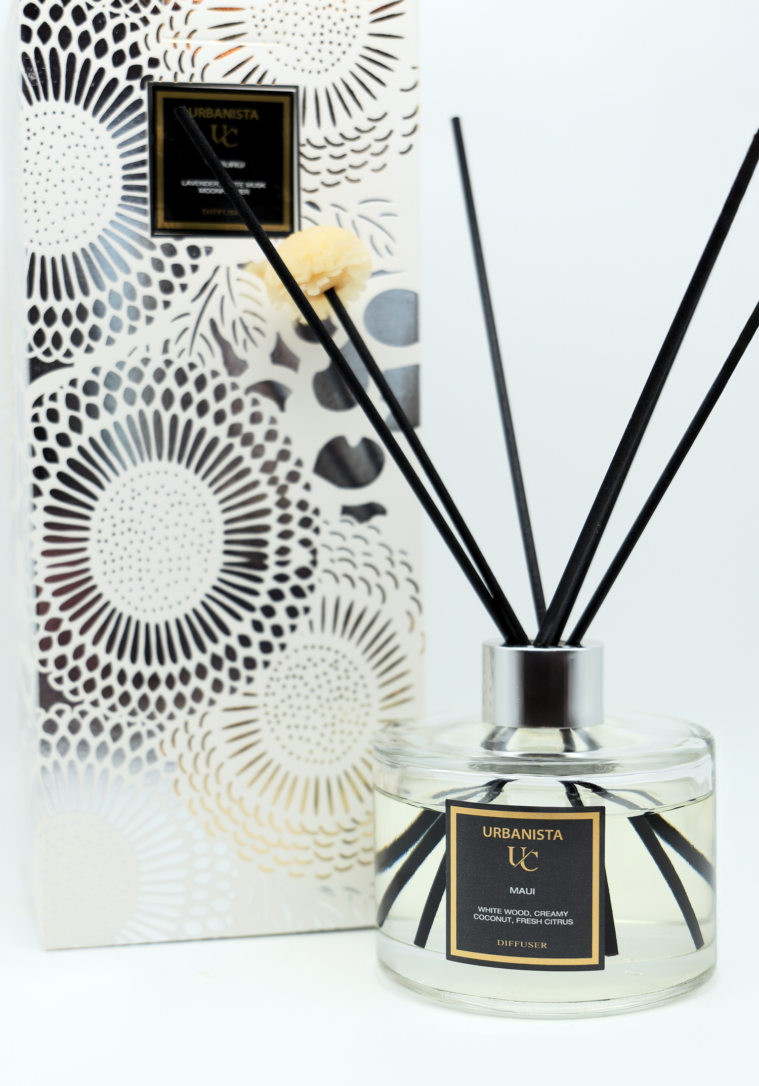 A sleek, modern reed diffuser features a minimalist design, fiber reeds for continuous, effortless fragrance. Stylish and flame-free, it adds a refined, contemporary touch to any space.